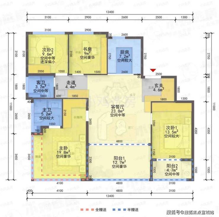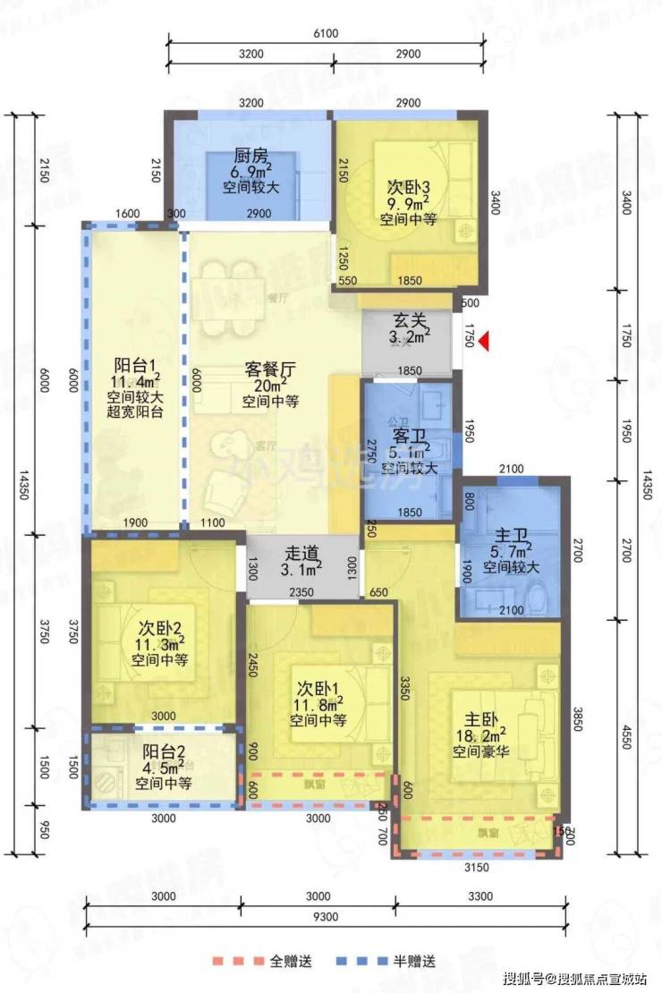 ❶建筑面积约120㎡户型,4房2厅2卫,含赠送得房率约88%。