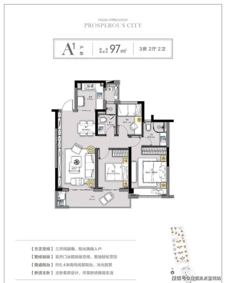 建面约97㎡是三房两厅两卫户型,为中间套。