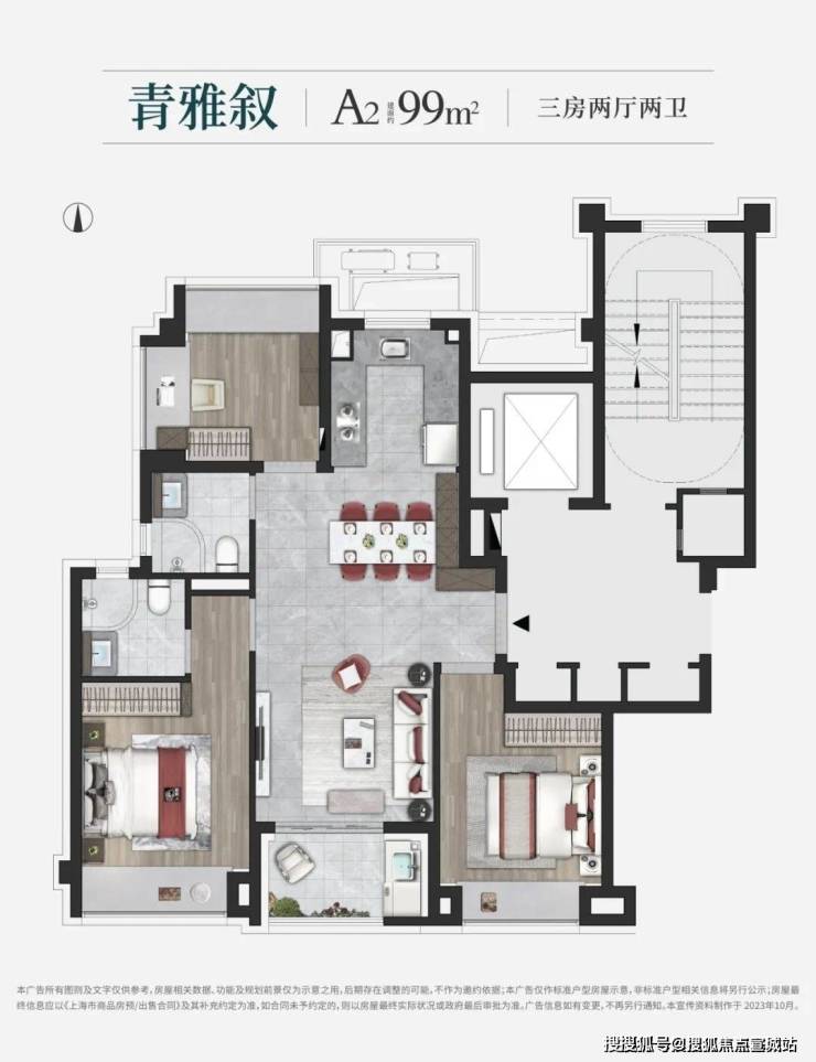 建面约99㎡3房(A1户型),做到了3.5开间朝南设计,整个户型几乎没有浪费面积~实现空间节约、居住升级等美好体验.