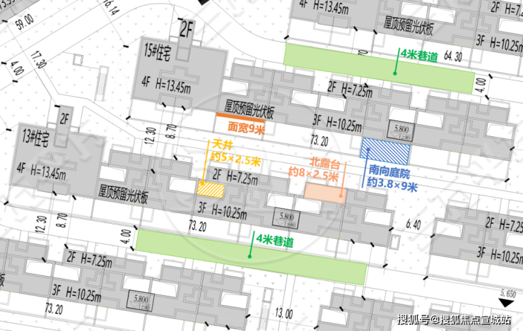 ③拓展空间值得期待:三万平方据公示图推测,户型设计一处内天井(宽约5米、深约2.5米),未来可以作为拓展空间,顶层利用建筑退台形成北露台(宽约8米、深约2.5米),赠送满满;同时屋顶预留光伏板设计,后期也可做进一步改造空间。