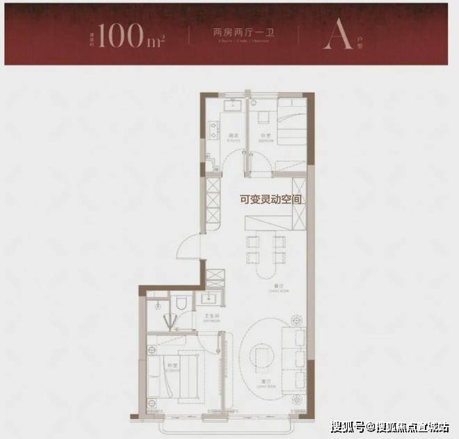 因为100平的2房布局,使得客餐厅一体的布局其实非常开阔,比起100㎡的3房来说, 功能缺失一个房间,但现有的实际尺度感要舒适很多.