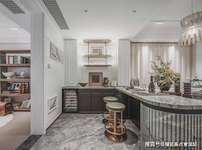更好更奢的归家门庭,嘉佩乐酒店风格,海派元素充满空间的每一个角落,地面的复古花纹,金属镂空装饰墙,普拉达绿的奢石点缀,仿佛穿越到了摩登时代.