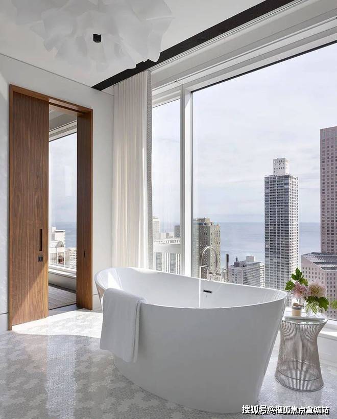 就连浴室也确保了极好的视野,大玻璃窗的设计让整个空间的光线感十足。