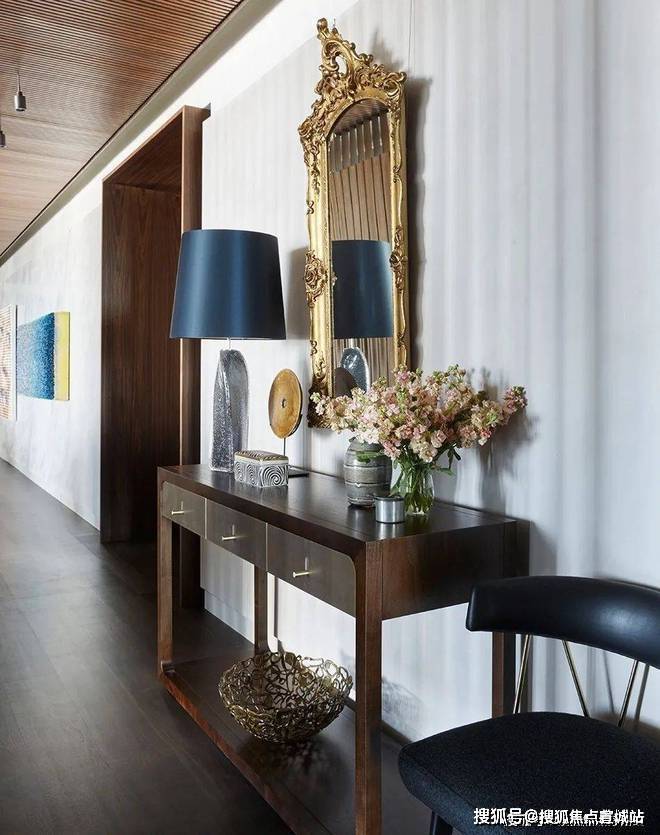 百分之百的优雅对材质的要求异常严格,而胡桃木的材质恰好强调了空间的高级感,利用老式LaVerne茶几、KellyWearstler的椅子和FortStreetStudio的地毯让人仿佛穿越回五十年代的复古时空。