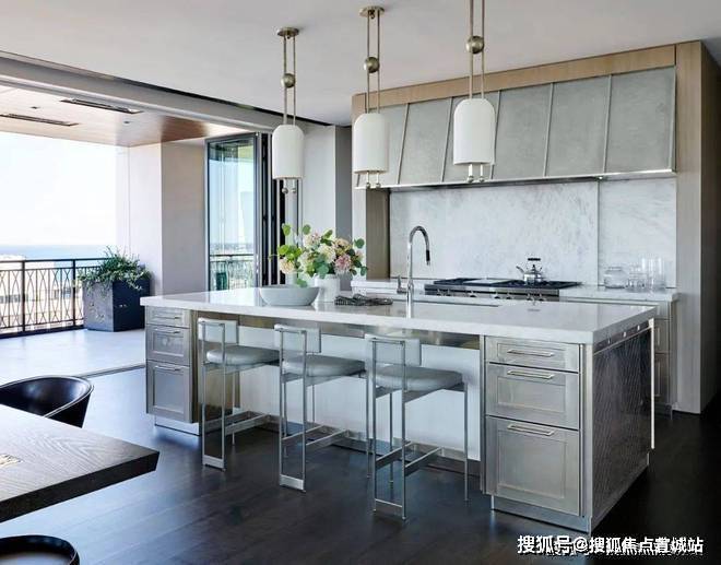 从客厅开始,整个空间都遍布着蓝色的元素,设计师以星座为主题进行设计,搭配上JamesThomas的茶几、HollyHunt的沙发、Minotti的扶手椅和AndriannaShamaris的边桌,打造既高级又充满梦幻感的居家空间。