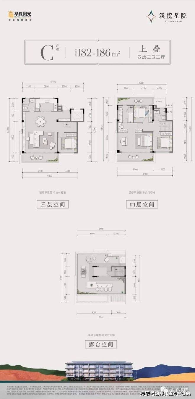 建面约182~186㎡上叠:约6m顶层观景阳台/餐客厅、书房开放设计/套房式主卧