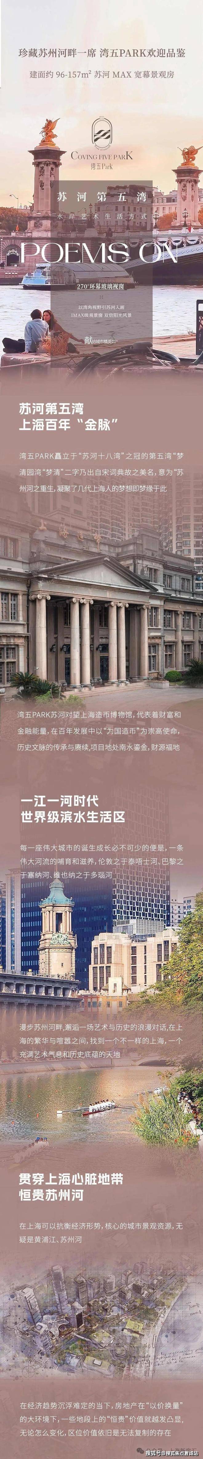湾五park售楼处营销中心:400-8828-814湾五park售楼处电话/地址☎:400-882-8814(开发商热线)苏河第五湾 春雨渐河畔 苏州河畔精装公寓、苏河湾、长风等高端住区也在发展中崛起,苏河湾更是已成一线顶流,标杆次新华侨城苏河湾二手均价能卖到20万/㎡+;近年来招商苏河玺、越秀·苏河·和樾府等盘入市,更是迅速清盘。我们从沿岸板块天梯图排名也可感受到,自西向东流向的苏州河沿岸板块,也正与环线逻辑相契合,越往内地段越好。这一点,与黄浦江沿岸截然相反,后者更多异军突起的新兴板块,如前滩、徐汇滨江与东外滩等。