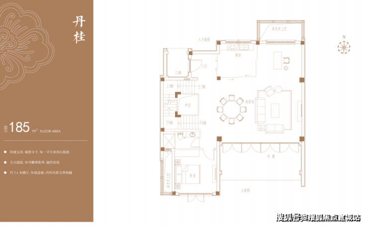 房屋实际可用面积要比户型图标注面积大一些,以“丹桂”户型为例,户型图标注的建筑面积为185m²,但是层高最高处可达到9.9米,未来完全可以搭建二层,搭建后,地上使用面积可以达到约280m²左右;