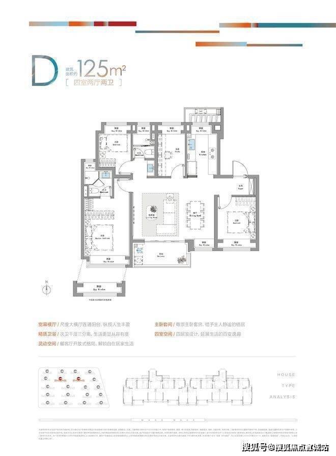 建面约123㎡的四房户型,拥有超大尺度横厅连通阳台,四开间朝南+主卧大套房,给予业主不输千万豪宅的居住体验!