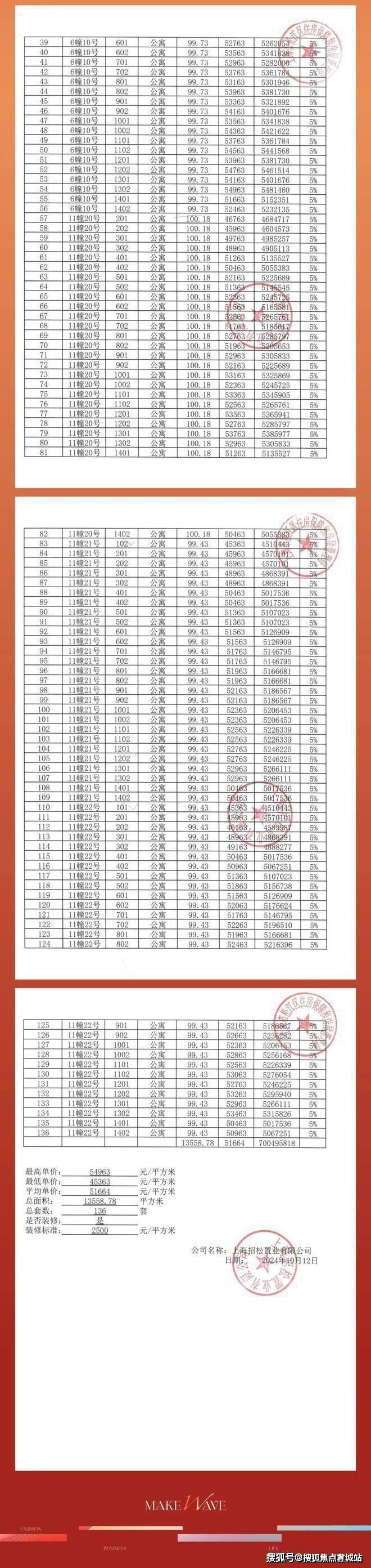 过会均价51664元/m²、装标2500/m²