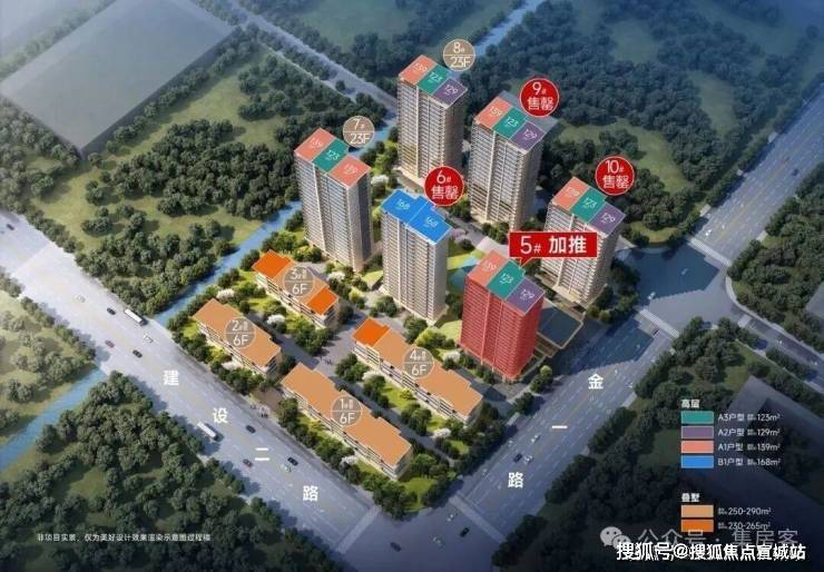 项目位于建设二路与金一路的交会处,依托方正的地形,规划了6幢高层+4幢叠排,其中高层住宅仅356套。户型方面,本次首开的2幢高层(9、10号楼),主推建面约123㎡的中间套,以及建面约129㎡、139㎡的边套,均为四房两厅两卫全明格局。