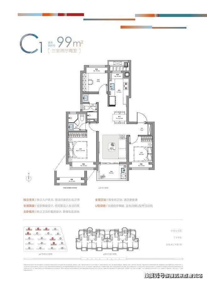 建面约99㎡B户型客餐厅配置超大尺度横厅,全卧室飘窗就连主卫也配置了一个飘窗;