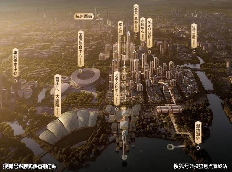 边上有市民中心、国际体育中心、艺术文化中心、音乐厅、科技馆、大剧院、OPPO移动终端研发总部、字节跳动华东中心、vivo全球AI研发中心钉钉全球总部、阿里巴巴等。