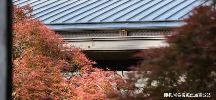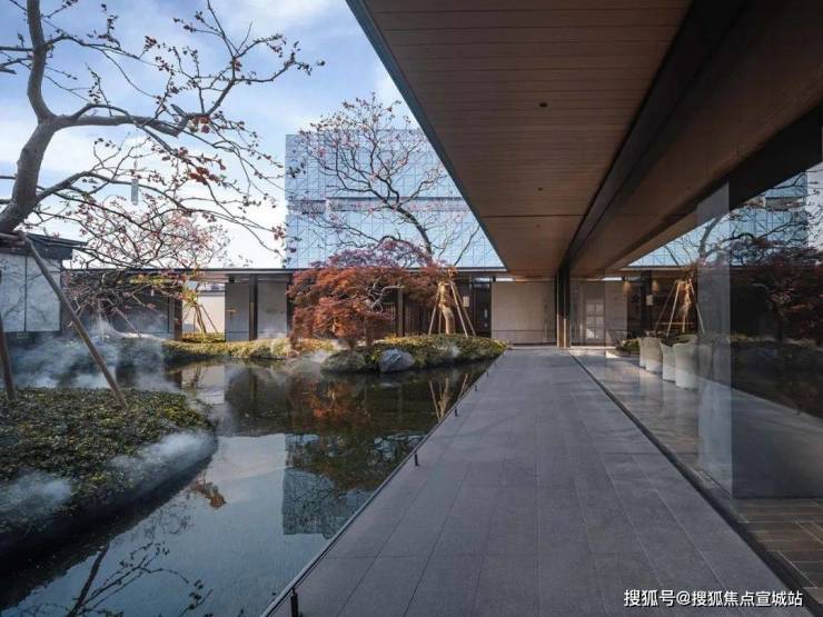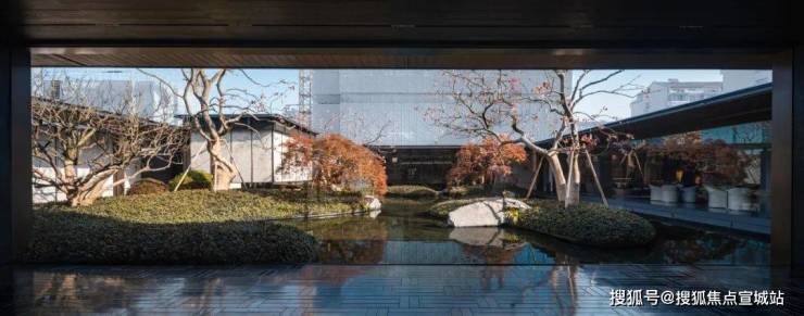 中心庭院,檐口低垂,入席而坐,欣赏对岸横向舒展的水院景观,镜面水景将空间映衬延展。