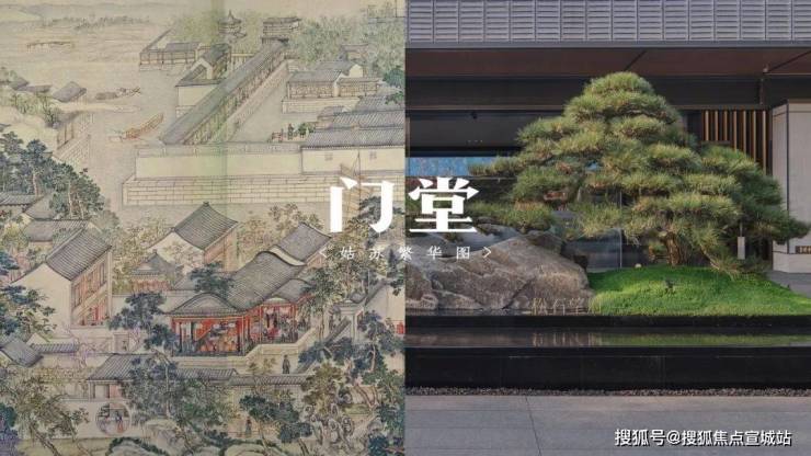 建筑门堂主体高宽比1:4,建筑与景墙横向延展,塑造绵延的城市画卷,融入奢华与精致的材质细节,勾勒出江南姑苏城独有的诗意东方风情。仿佛一幅流动的江南水墨,细腻而深邃,将苏州的精致与典雅完美融合,展现出江南的韵味。