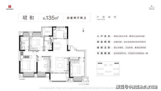 主力户型:135㎡、152㎡、179㎡、224㎡四房,得房率约 82%;135㎡为四房两厅两卫,179㎡、224㎡为四房两厅三卫。