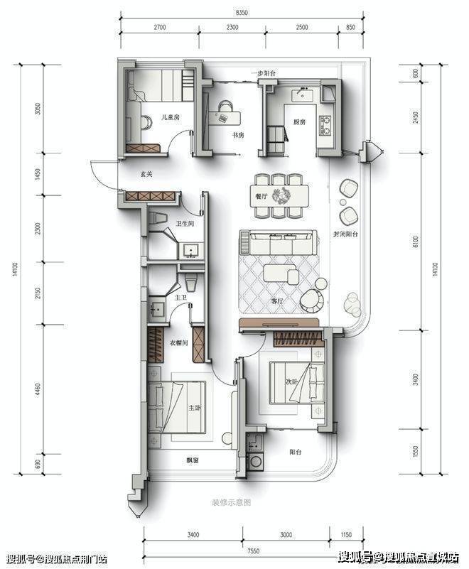 起步约94方户型也很能「打」—三开间朝南,南向开间将近10米,客厅连通了进深约1米5的大阳台。仔细看,玄关边还预留了一处「深U空间」,俗称S墙,可以塞下双开门冰箱,完美解决小户型冰箱的放置问题。