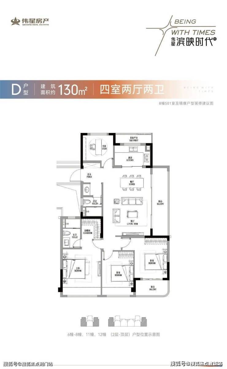 想改善一步到位的购房者还有建面约130方4房:最大的建面约130㎡则是舒适四房格局,这个户型最大的亮点在于双阳台,除了侧边横厅连接一个建面约9㎡的阳台,南面的次卧还连接着一个小阳台。