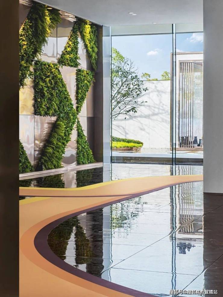 示范区位于项目南端,人流在人民路上的精神堡垒指引下行入泾湾路,沿路景观带到展示区大门,进入大门是大空间的景观广场,汇集停车场人员沿着景观无边水池进入售楼处.