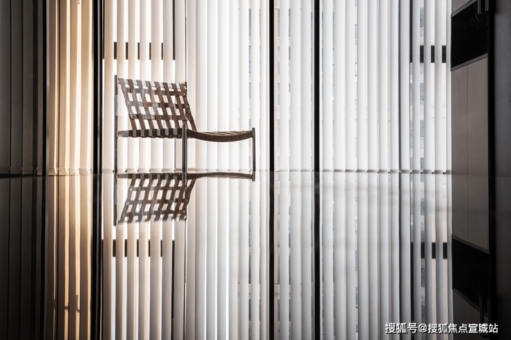 垂直百叶窗将透过大落地窗照进家中的光线均匀切开,营造出光影的效果,既保证了充足的光线又有效保证了隐私性.