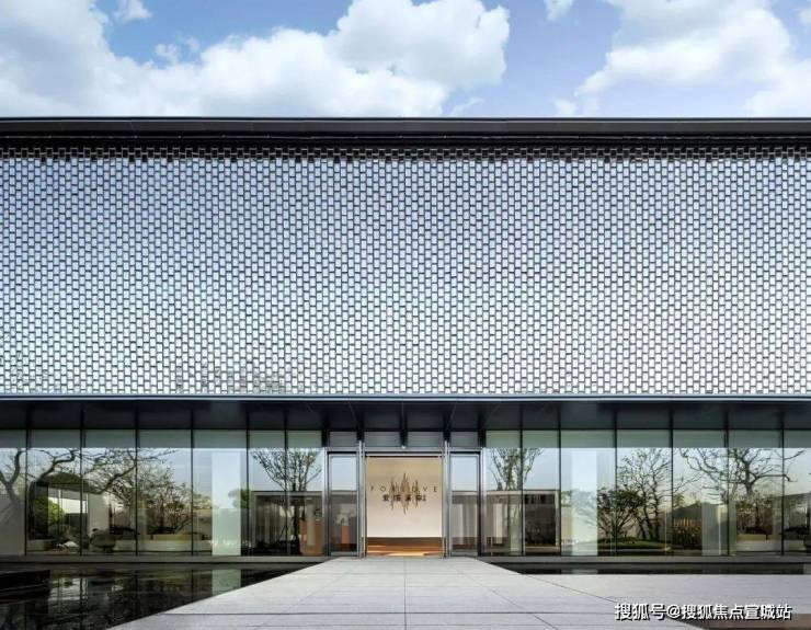 示范区主立面以银白不锈钢风动片为主,辅以珍珠白色铝板和浅灰色玻璃.徐风吹过,不锈钢片波动泛起涟漪,仿佛江南灵动的水系,勾勒出建筑独特的气质.
