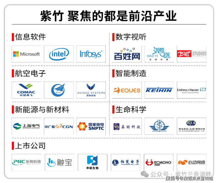 紫竹聚焦“集成电路与软件、新能源、航空航天、智能制造、数字视听、生命科学”六大前沿赛道, 微软、英特尔、可口可乐、晟碟半导体、 印孚瑟斯技术、东软集团、 中国商飞等都多家世界500强进驻。