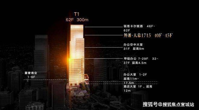 在这片建筑群中,总高达300米的T1是最引人瞩目的存在。底部1-6层为重奢商业,中部7-37层为甲级办公,中高区40-45层为行政公馆外滩·天幕1715,上部46-62层为丽思卡尔顿酒店,与浦东陆家嘴丽思卡尔顿酒店遥相呼应。