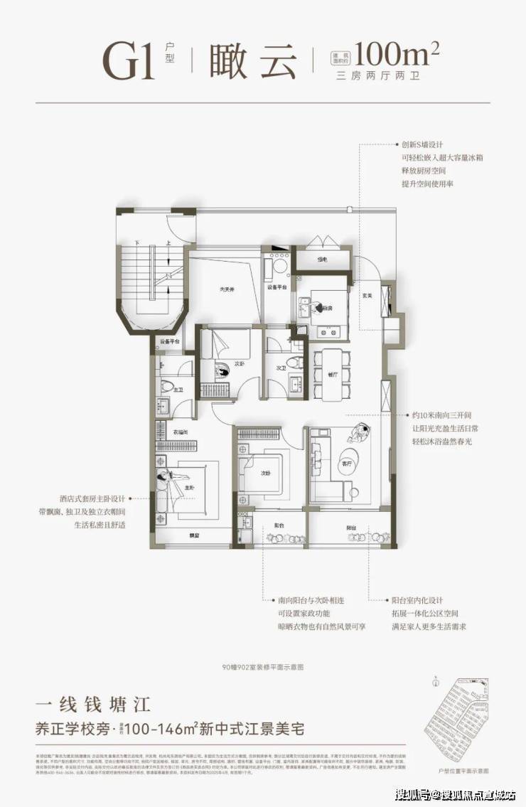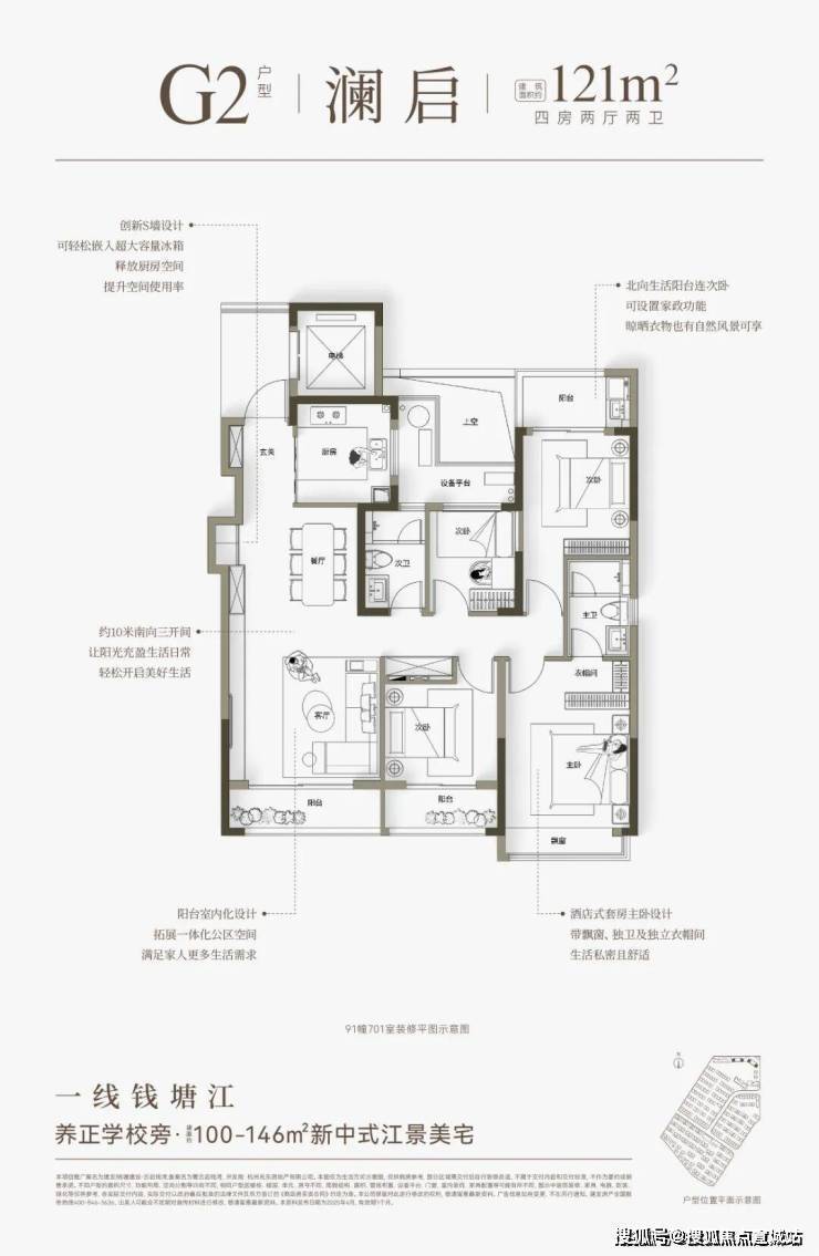 云启钱湾高层分为4种类型,建面约100㎡和建面约121㎡户型,做了创新S墙设计,提高了空间利用率,对年轻家庭来说,也是非常友好的。建面约146㎡四房户型,全部南向面江,大部分楼层还可看到一线江景。