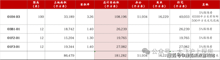 地块总占地面积33189方,容积率3.26,总建面176334平方米,地上计容建面108196平方米,地上不计容建面8704平方米,地下建面59434平方米。