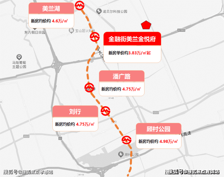 从7号线来说,往后一站的美兰湖,比金悦府贵了约8000元/㎡+,往前几站的潘广路、刘行和顾村公园,都比金悦府贵了1w/㎡上下!