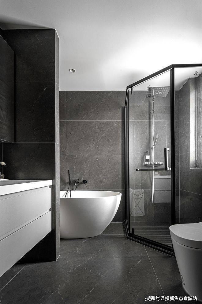 独立的盥洗室采用了哑光黑的设施和大理石的墙壁,凸显出一种奢华高雅的氛围。