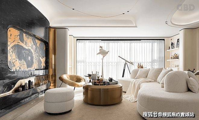 室内空间当中多种天空的元素引导出空间当中的奥妙,奶白色作为空间当中主要背景色,再加上金属元素的相互融合,又展示出空间当中的轻奢感。