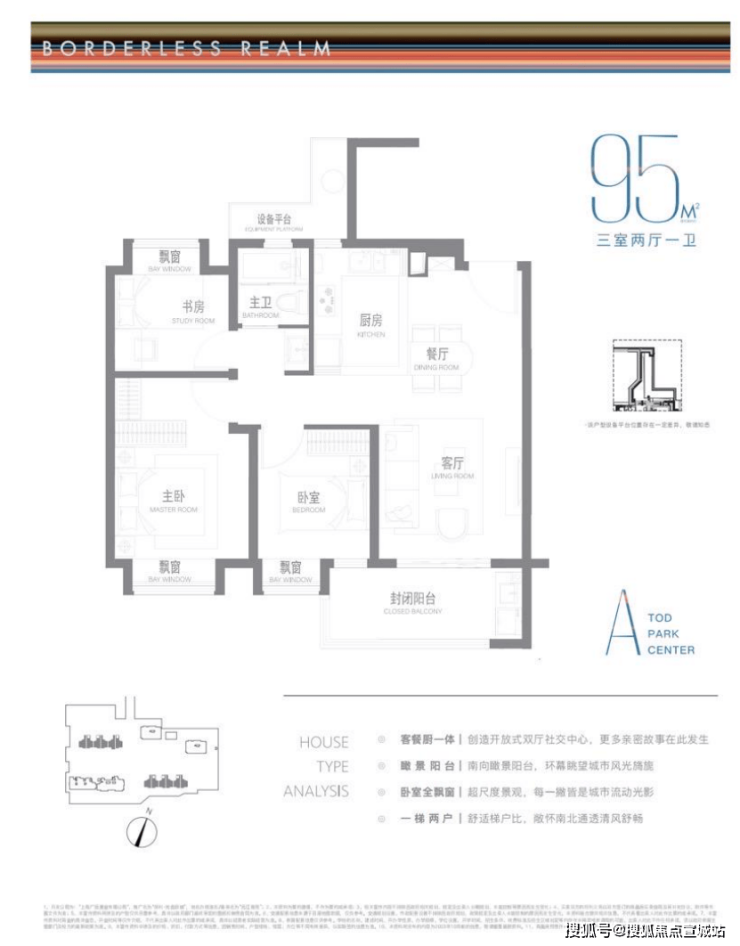 建面约95m²户型特点:开放式厨房,极度释放厨房与客厅的尺度与互动可能,无连廊设计,一梯两户极致梯户比,南北通透舒适感