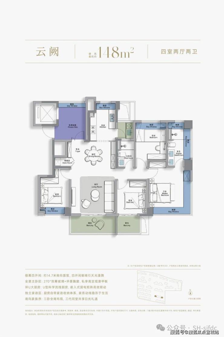 ▷建面约148㎡4房2卫:打造四房两厅两卫,四开间朝南,将阳光与舒适最大化引入室内。三阳台分区功能:创新三阳台设计,各司其职,解决生活痛点,提升品质。270度无柱景观飘窗(边套专属):大幅拓展空间与视野,采光通透感拉满。一梯一户配置:私享阳光梯厅,增加隐形使用面积,兼具收纳、私密性与仪式感,给予豪宅级居住体验。如果将次卧与客厅打通,形成了约34方的超大尺度会客厅,超大窗墙比让室内更明亮,采光、视野超棒。餐厅面宽与客厅同宽,可摆放6人位的圆形餐桌,轻松容纳全家人用餐。