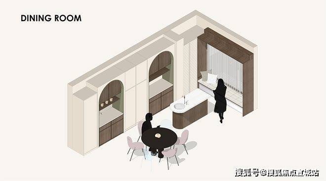 厨餐厅,内置双拱门造型,利用空间穿插、错景,划分餐厅与西厨区,开放互动气质与当代审美相结合,隔而不断,界而未界,留给空间更多的想象和延伸。