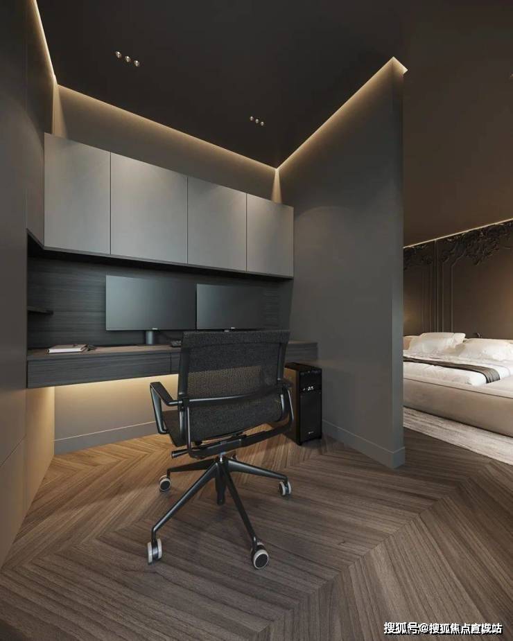 书房位于卧室,温润的柚木书桌,细腻的肤感吊柜,在极简的界面之下,配合着柔和的灯光效果,饱满的纹理呈现更具表现力,舒适的设计赋予了空间艺术之美。