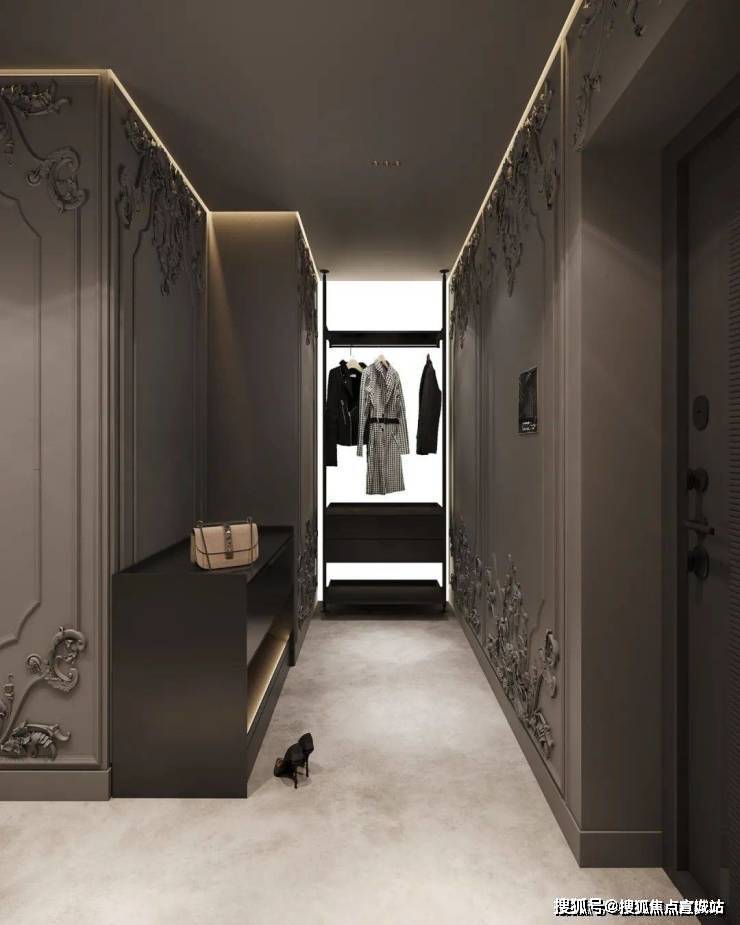 简洁大气的门厅空间,以高级灰作为主色搭配,大面积镜子、柚木护墙的铺设,减少了长过道的沉闷无趣,优雅的石膏线勾勒出古典层次,叙说出奢美的生活状态。