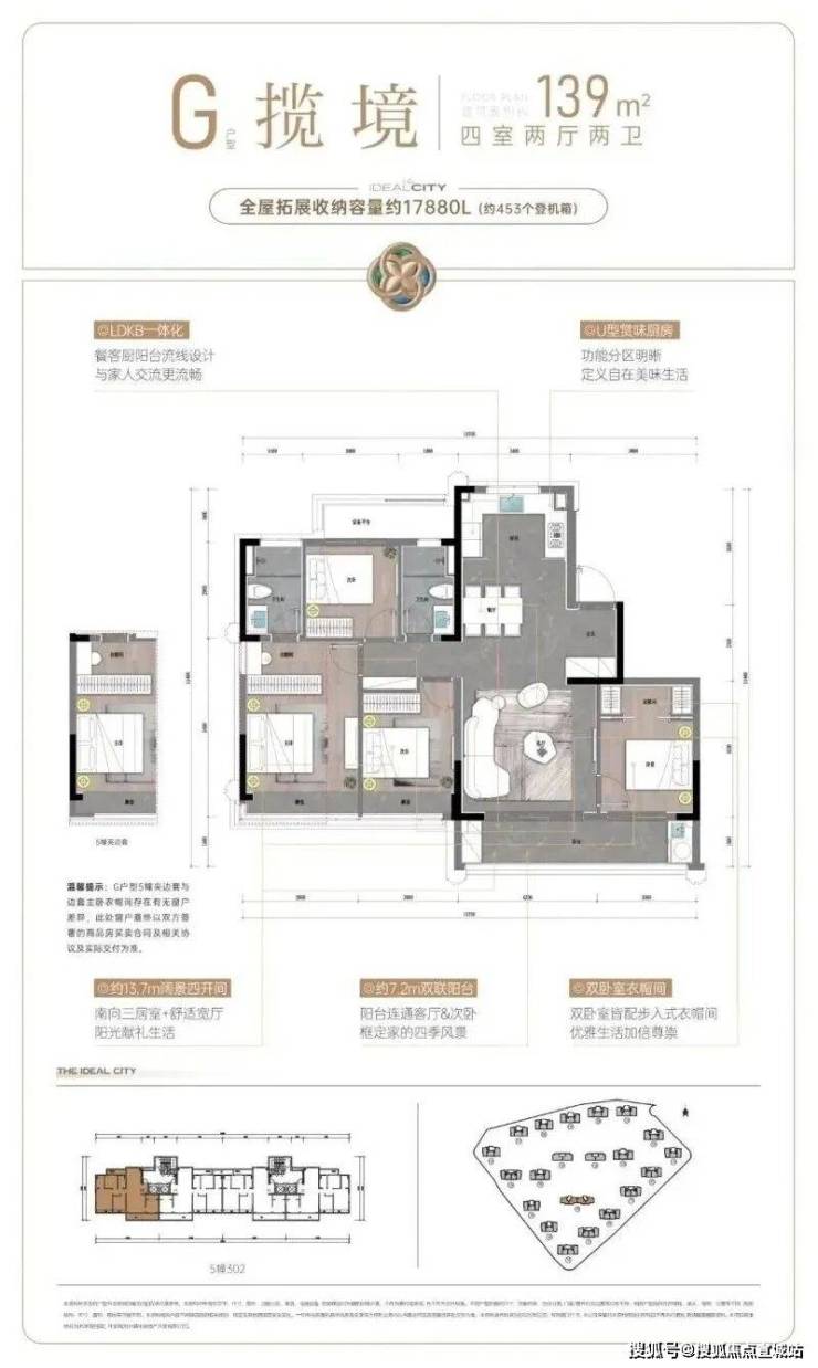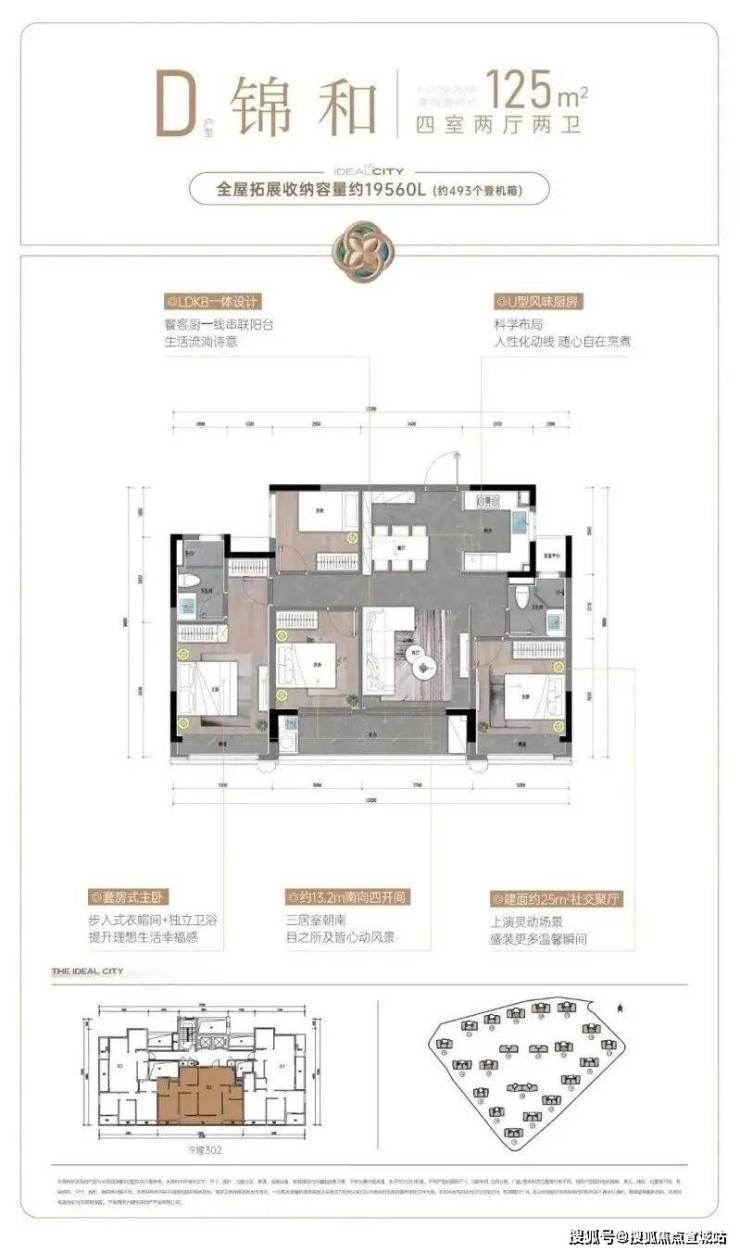 建面约107㎡户型,则把重点放在舒适度上。阔绰方厅+双联阳台,通风赏景至佳,还有U型厨房,三面操作空间,动线流畅好用;套房式主卧更配置了步入式衣帽间,独立卫浴设计,保证了主人家的隐私和仪式感。