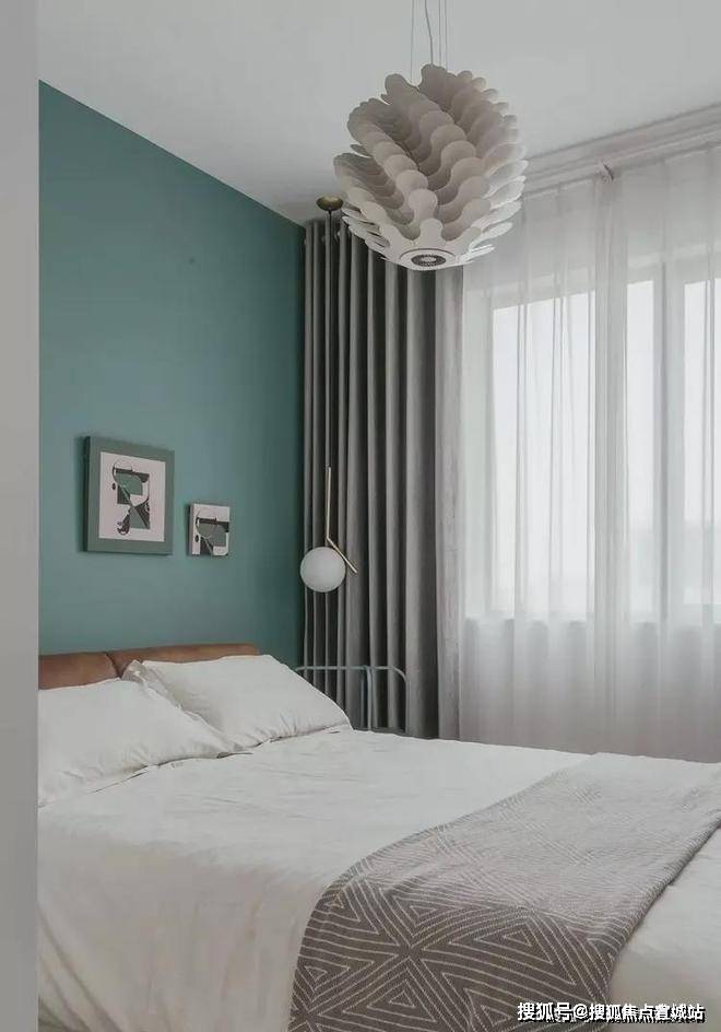 以海洋绿作为次卧床头背景墙主色调,配上灰色窗帘,优雅静谧.相同色相的装饰画,螺旋式吊灯,让居住者感觉自由和洒脱,赋予生活舒适感.