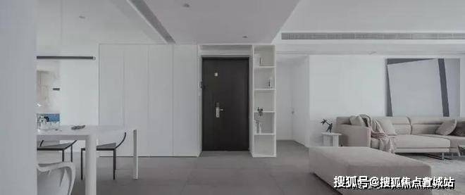入户通过两侧增加收纳柜满足鞋子的收纳需求,定制柜的设计也有效避免了入户对室内空间的一览无余.