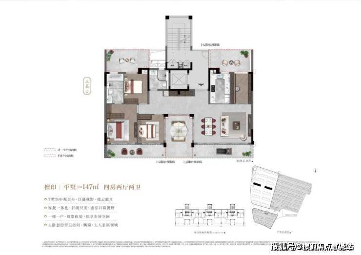 一梯一户;南侧T型超大景观阳台+北侧双露台;套房主卧,步入式衣帽间
