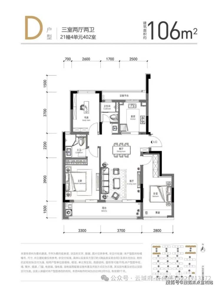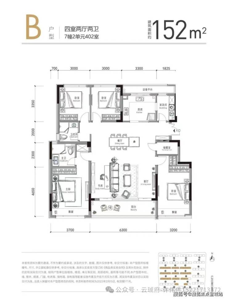 所有户型配备双阳台、最大至6.3米宽大尺度客餐厅,四房户型均配置独立储藏间。