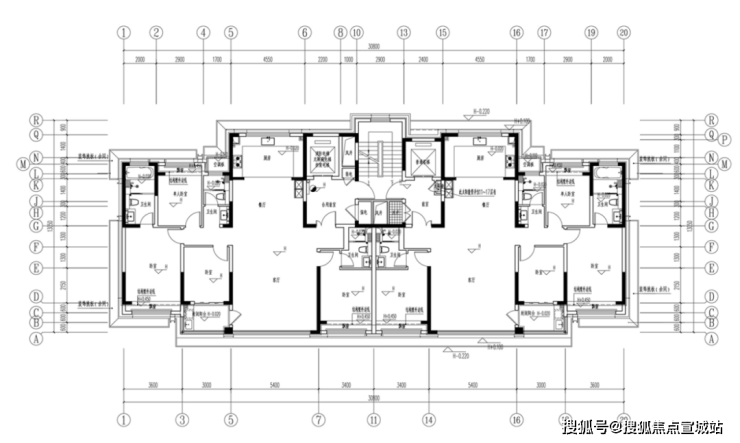 从平面图来看,采用2梯4户的设计,3房2厅2卫布局,3开间朝南;客厅开间约4米;两个朝南卧室,一个北向卧室,全屋飘窗,其中,南向主卧套房设计,满足一家三口居住需求。
