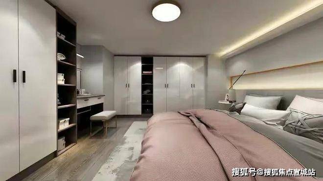 卧室的设计相较于客厅来说,更显温馨。香槟色的线条在灰色基调里跳跃纷飞,玫瑰金与军绿色的四件套简直是简约轻奢的极致搭配。再配上隐藏在墙里的温柔光线。一切既奢华又温馨。