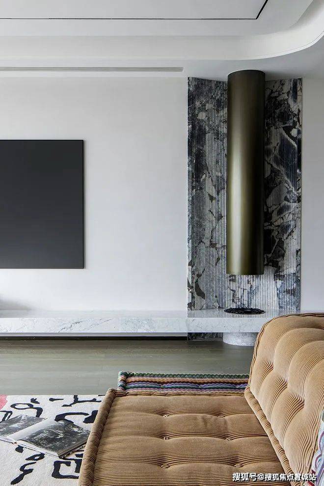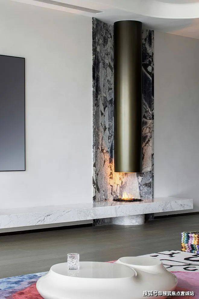 弧式吊顶联同艺术圆状壁炉,实现柔化效果,转而融入整体家具风格之中。每一处空间角落,皆彰显着统一格局,迎合顺畅流线的渲染,构建出非常完整的温馨家居环境。