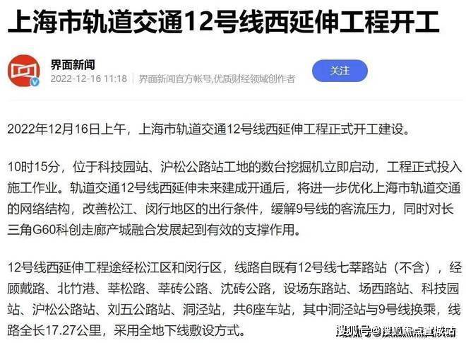 目前12号线西延伸正在加速推进,预计2027年底开通试运营.12号线西延伸在松江境内从G60云廊沿沈砖公路,东西向穿过洞泾,设沪松公路和刘五公路设站,在洞泾站与9号线交汇.