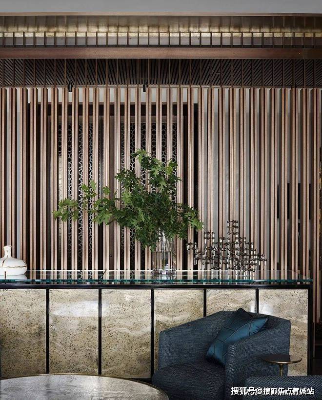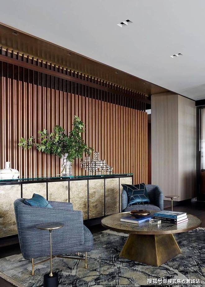 百分之百的优雅对材质的要求异常严格,而胡桃木的材质恰好强调了空间的高级感,利用老式LaVerne茶几、KellyWearstler的椅子和FortStreetStudio的地毯让人仿佛穿越回五十年代的复古时空。