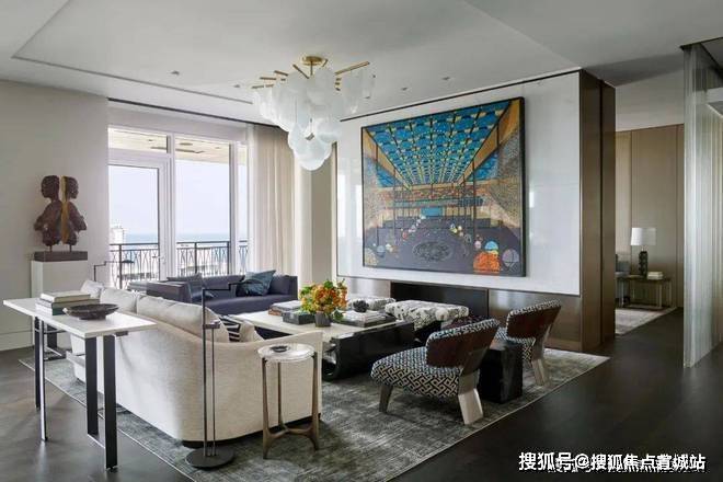 从客厅开始,整个空间都遍布着蓝色的元素,设计师以星座为主题进行设计,搭配上JamesThomas的茶几、HollyHunt的沙发、Minotti的扶手椅和AndriannaShamaris的边桌,打造既高级又充满梦幻感的居家空间。