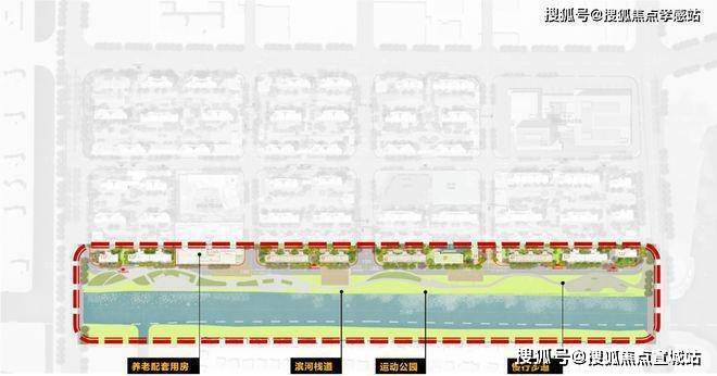 一界面是滨水景观界面(项目红线外),依托南侧的天然水系及滨水公园,打造慢行景观系统,并将滨河栈道、运动公园、骑行等多种功能嵌入,提升舒适度的同时,也为居民提供放松身心的好去处。