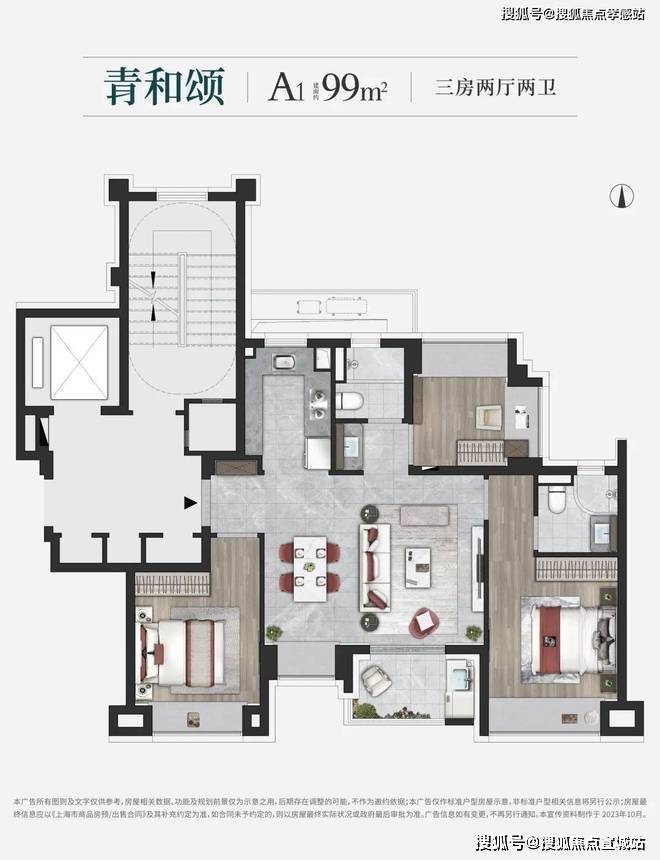 建面约99㎡3房(A1户型),做到了3.5开间朝南设计,整个户型几乎没有浪费面积~实现空间节约、居住升级等美好体验。